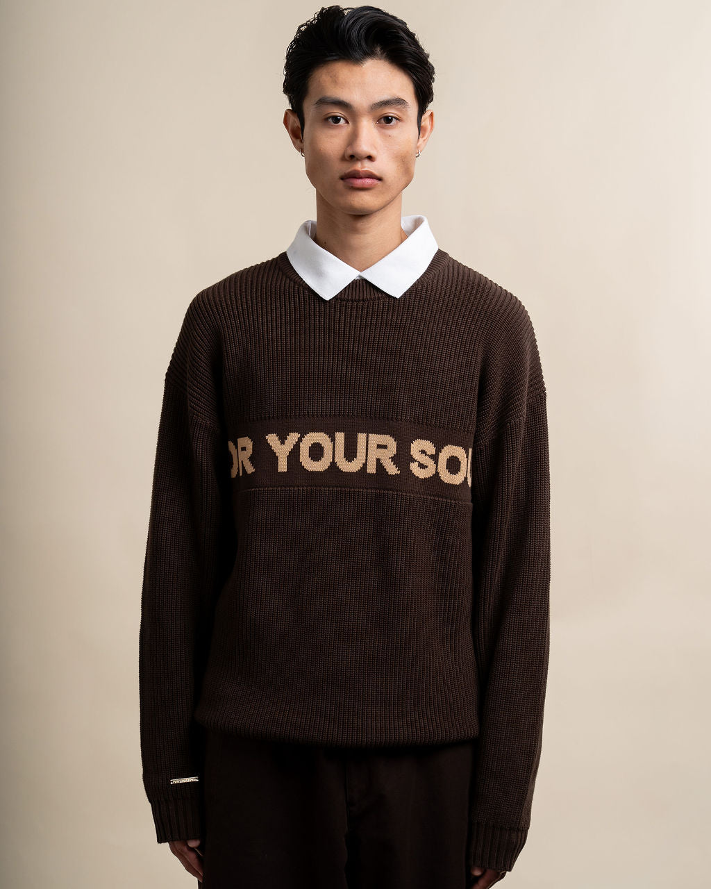 A luxurious sweater that redefines the everyday essential. Crafted from soft, high-quality fabric, it features For Your Soul delicately knitted across the chest. A subtle statement of intention and timeless style.